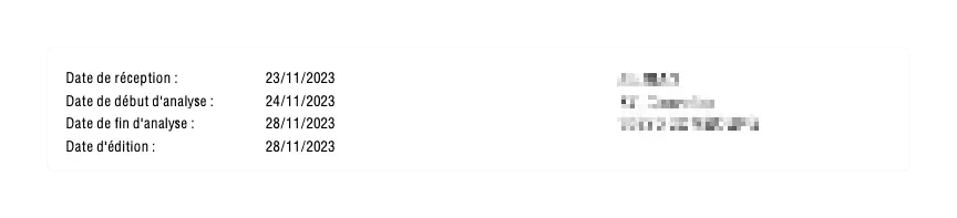 📅 Exemple : sur notre certificat, l’échantillon a été reçu le 23/11/2023 et analysé jusqu’au 28/11/2023.
