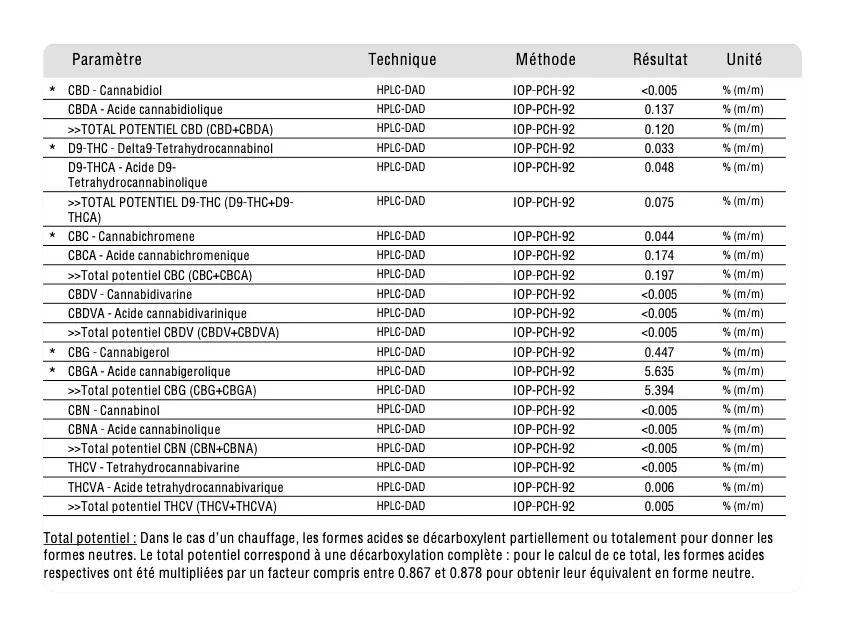 Chaque ligne représente un cannabinoïde détecté dans l’échantillon, avec :
